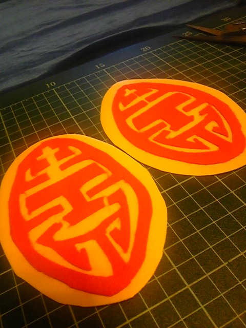 肘の模様切り抜き終了じゃあー!!赤を上に重ねたけど実は逆なのじゃー!ほんとは赤を土台に黄色を重ねるのが正しいんじゃー!!!!わし間違った!でももう強制終了するんじゃー!