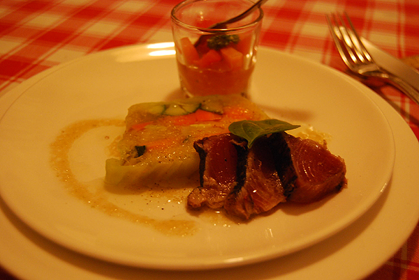 トマトのジュレが良い塩味でウマー!野菜のテリーヌも具沢山で美味しいです。
