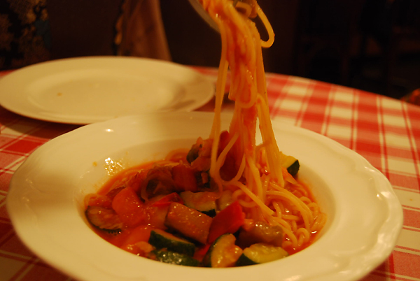 ズッキーニと茄子などの野菜多めのソースに自家製生パスタ。