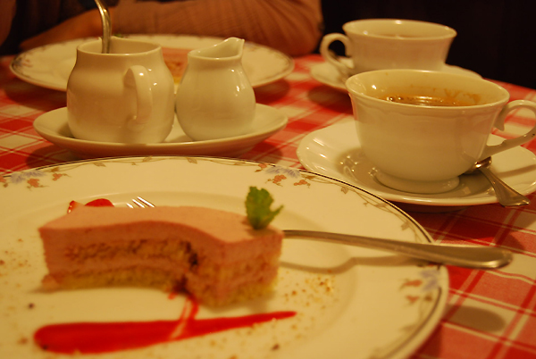 イチゴと桃のソルベとフランボワーズのケーキ、珈琲紅茶。